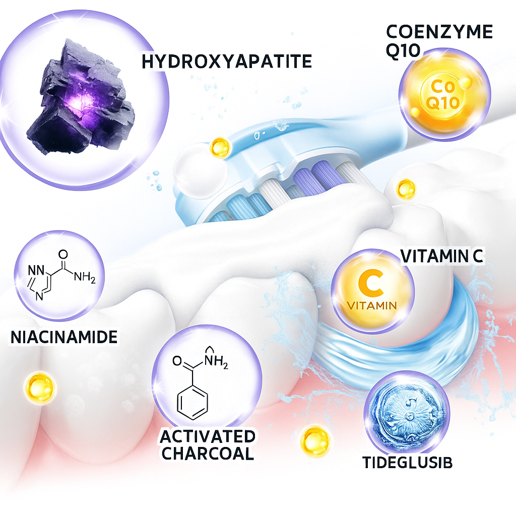 Niacinamideļ¼Whitens teeth by inhibiting melanin production, reduces inflammation, and promotes healthier gums.